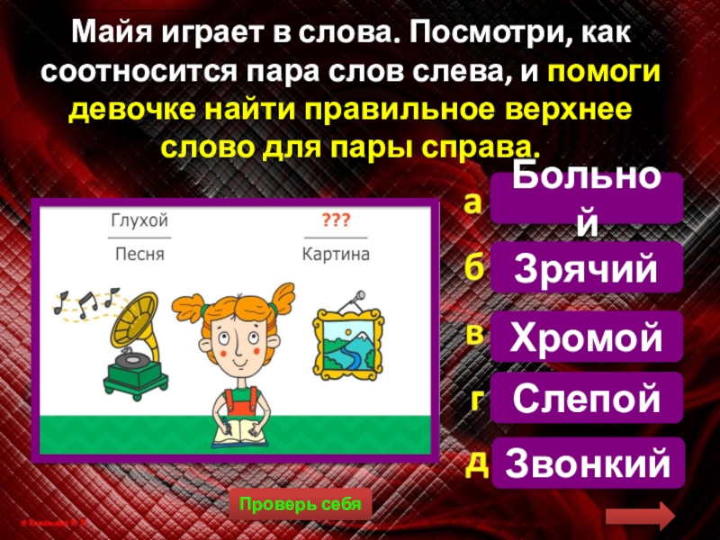 Майя играет в слова. Посмотри, как соотносится пара слов слева, и помоги девочке найти правильное верхнее слово для пары справа.
