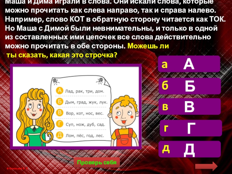 Маша и Дима играли в слова. Они искали слова, которые можно прочитать как слева направо, так и справа налево. Например, слово КОТ в обратную сторону читается как ТОК. Но Маша с Димой были невнимательны, и только в одной из составленных ими цепочек все слова действительно можно прочитать в обе стороны. Можешь ли