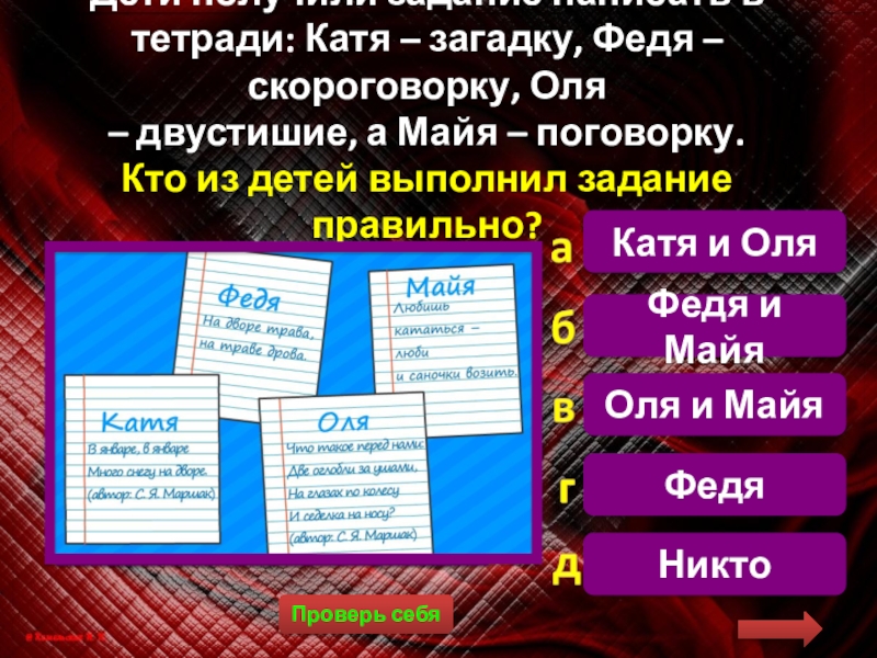 Дети получили задание написать в тетради: Катя – загадку, Федя – скороговорку, Оля