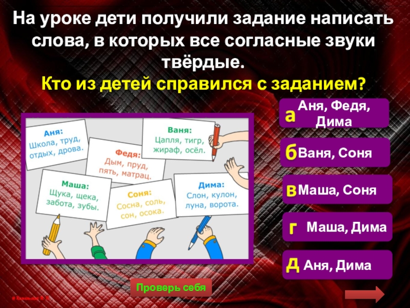 На уроке дети получили задание написать слова, в которых все согласные звуки твёрдые.