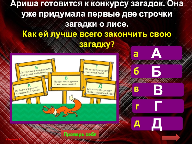 Ариша готовится к конкурсу загадок. Она уже придумала первые две строчки загадки о лисе.