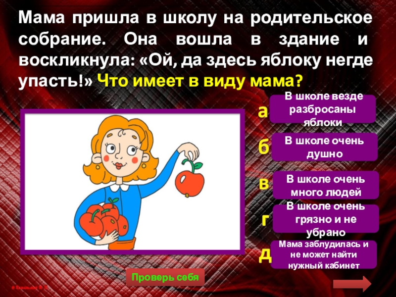 Мама пришла в школу на родительское собрание. Она вошла в здание и воскликнула: «Ой, да здесь яблоку негде упасть!» Что имеет в виду мама?