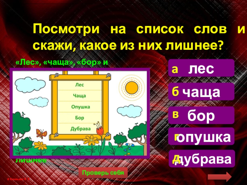 Посмотри на список слов и скажи, какое из них лишнее?
