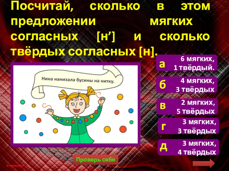 Посчитай, сколько в этом предложении мягких согласных [н’] и сколько твёрдых согласных [н].