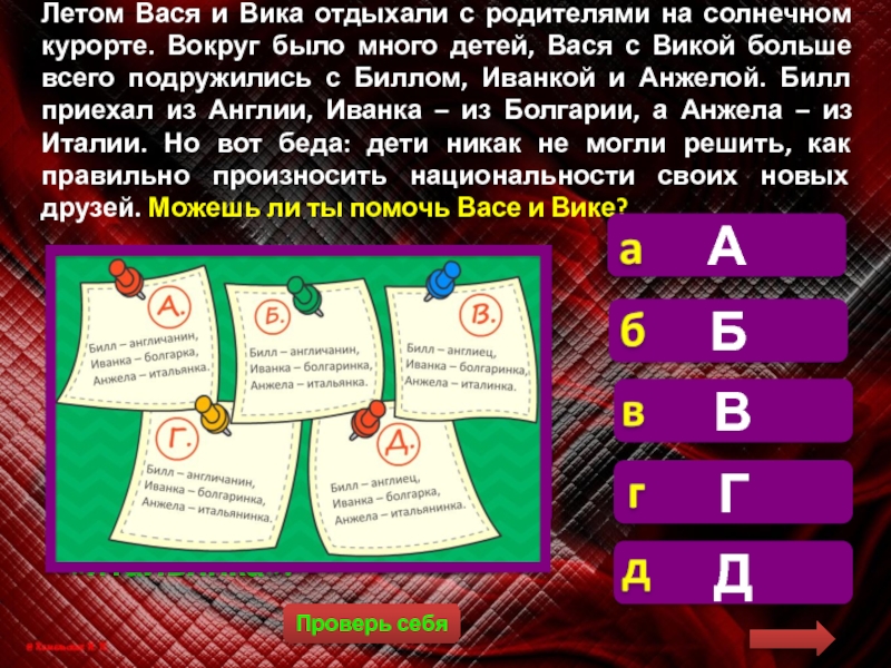 Летом Вася и Вика отдыхали с родителями на солнечном курорте. Вокруг было много детей, Вася с Викой больше всего подружились с Биллом, Иванкой и Анжелой. Билл приехал из Англии, Иванка – из Болгарии, а Анжела – из Италии. Но вот беда: дети никак не могли решить, как правильно произносить национальности своих новых друзей. Можешь ли ты помочь Васе и Вике?