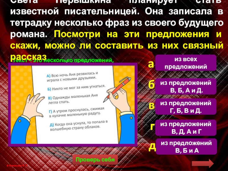 Света Пёрышкина планирует стать известной писательницей. Она записала в тетрадку несколько фраз из своего будущего романа. Посмотри на эти предложения и скажи, можно ли составить из них связный рассказ