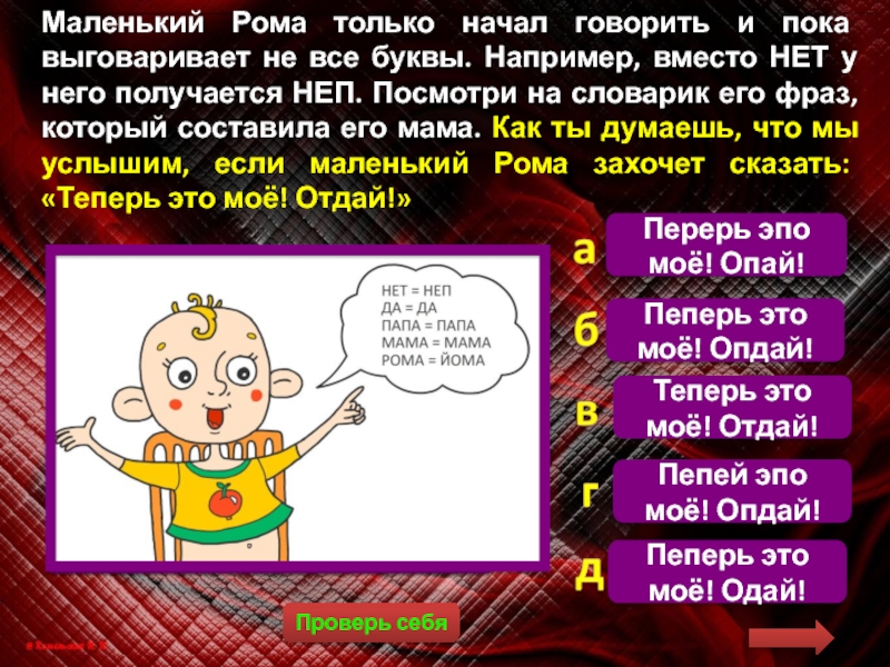 Маленький Рома только начал говорить и пока выговаривает не все буквы. Например, вместо НЕТ у него получается НЕП. Посмотри на словарик его фраз, который составила его мама. Как ты думаешь, что мы услышим, если маленький Рома захочет сказать: «Теперь это моё! Отдай!»