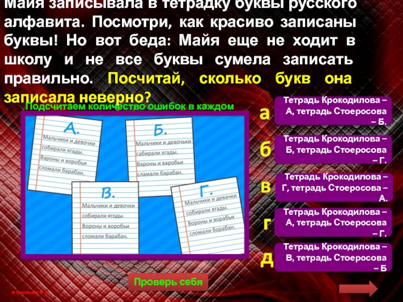 Тетрадь Крокодилова – Б, тетрадь Стоеросова – Г.