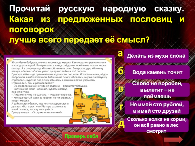 Прочитай русскую народную сказку. Какая из предложенных пословиц и поговорок