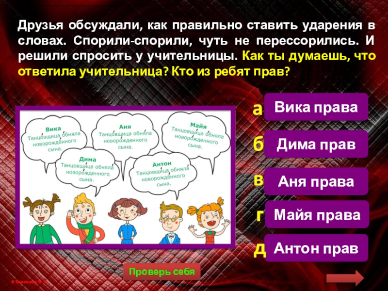 Ответив на вопрос, нажимайте на кнопку с предложенными вариантами ответов.