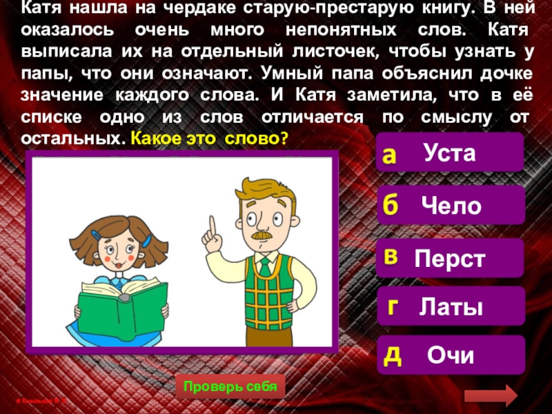 Катя нашла на чердаке старую-престарую книгу. В ней оказалось очень много непонятных слов. Катя выписала их на отдельный листочек, чтобы узнать у папы, что они означают. Умный папа объяснил дочке значение каждого слова. И Катя заметила, что в её списке одно из слов отличается по смыслу от остальных. Какое это слово?