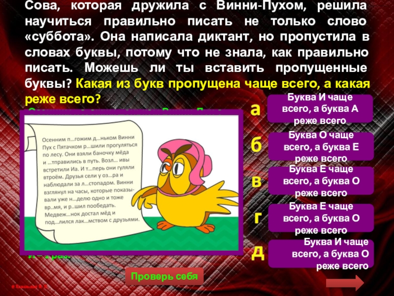 Сова, которая дружила с Винни-Пухом, решила научиться правильно писать не только слово «суббота». Она написала диктант, но пропустила в словах буквы, потому что не знала, как правильно писать. Можешь ли ты вставить пропущенные буквы? Какая из букв пропущена чаще всего, а какая реже всего?