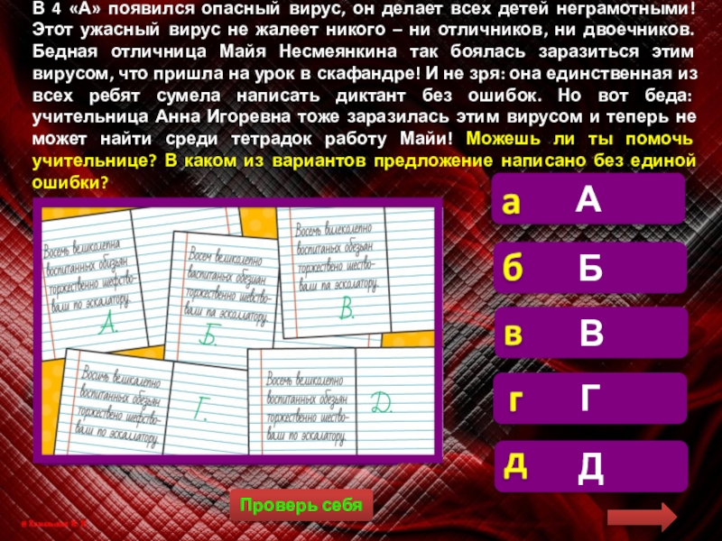 В 4 «А» появился опасный вирус, он делает всех детей неграмотными! Этот ужасный вирус не жалеет никого – ни отличников, ни двоечников. Бедная отличница Майя Несмеянкина так боялась заразиться этим вирусом, что пришла на урок в скафандре! И не зря: она единственная из всех ребят сумела написать диктант без ошибок. Но вот беда: учительница Анна Игоревна тоже заразилась этим вирусом и теперь не может найти среди тетрадок работу Майи! Можешь ли ты помочь учительнице? В каком из вариантов предложение написано без единой ошибки?