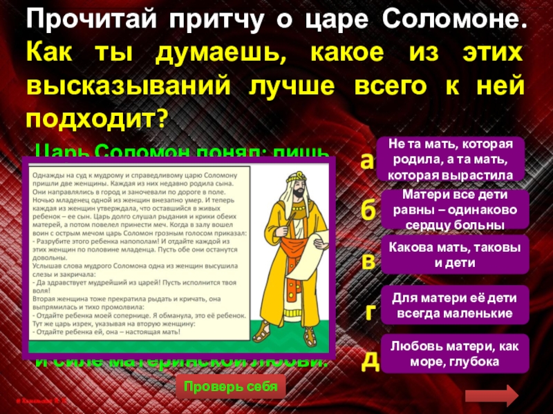 Прочитай притчу о царе Соломоне. Как ты думаешь, какое из этих высказываний лучше всего к ней подходит?