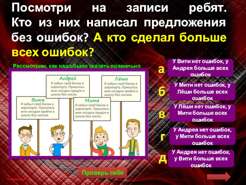Кто из них написал предложения без ошибок? А кто сделал больше всех ошибок?
