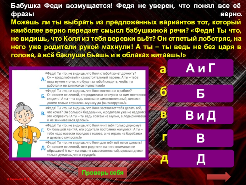 Можешь ли ты выбрать из предложенных вариантов тот, который наиболее верно передает смысл бабушкиной речи? «Федя! Ты что, не видишь, что Коля из тебя веревки вьёт? Он отпетый лоботряс, на него уже родители рукой махнули! А ты – ты ведь не без царя в голове, а всё баклуши бьешь и в облаках витаешь!»