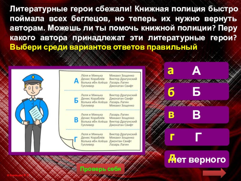 Литературные герои сбежали! Книжная полиция быстро поймала всех беглецов, но теперь их нужно вернуть авторам. Можешь ли ты помочь книжной полиции? Перу какого автора принадлежат эти литературные герои? Выбери среди вариантов ответов правильный
