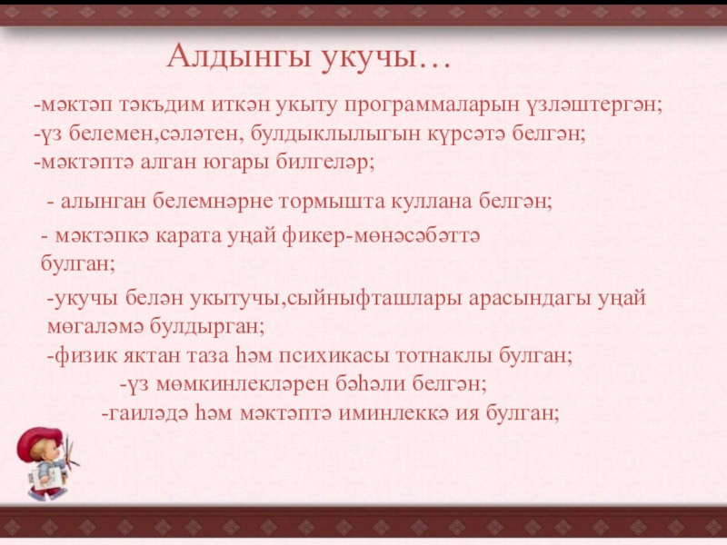 - мәктәпкә карата уңай фикер-мөнәсәбәттә булган;