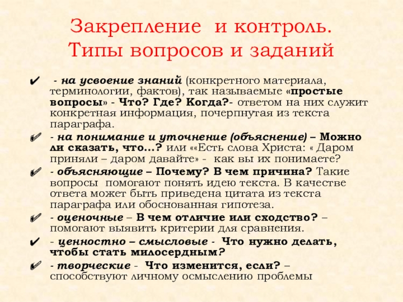 - на понимание и уточнение (объяснение) – Можно ли сказать, что…? или ««Есть слова Христа: « Даром приняли – даром давайте» - как вы их понимаете?