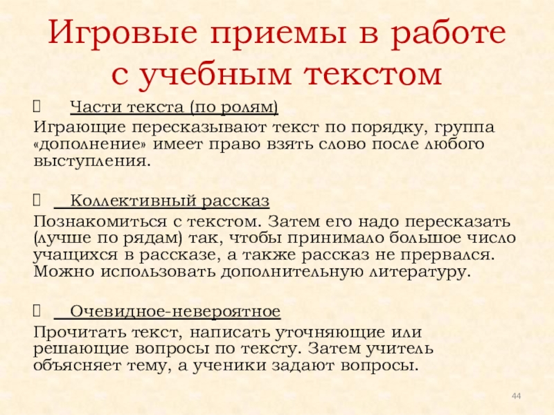 Слайд 44Игровые приемы в работе с учебным текстом