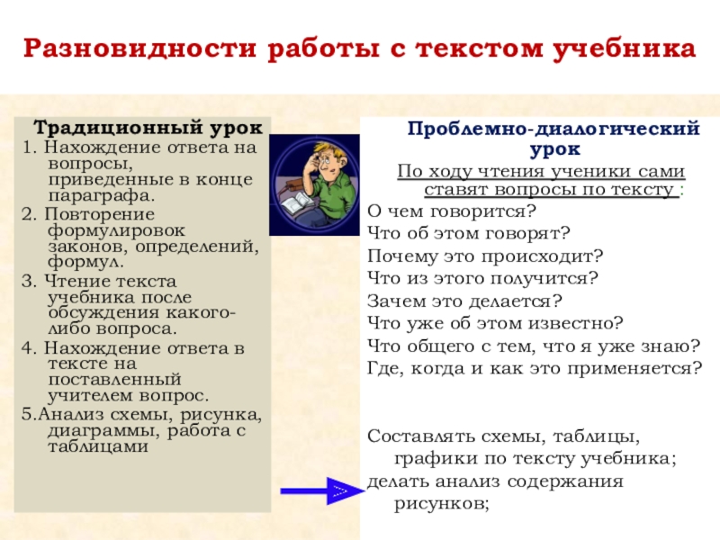Прочитать текст, написать уточняющие или решающие вопросы по тексту. Затем учитель объясняет тему, а ученики задают вопросы.