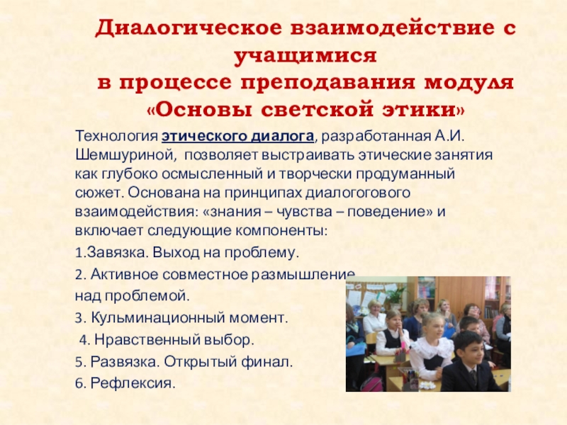 этического диалога, разработанная А.И.Шемшуриной, позволяет выстраивать этические занятия как глубоко осмысленный и творчески продуманный сюжет. Основана на принципах диалогогового взаимодействия: «знания – чувства – поведение» и включает следующие компоненты: