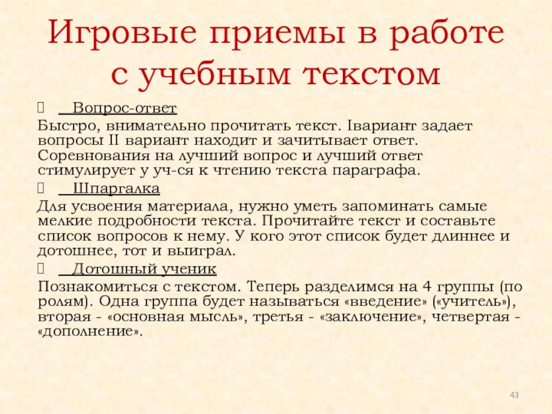 Слайд 43Игровые приемы в работе с учебным текстом