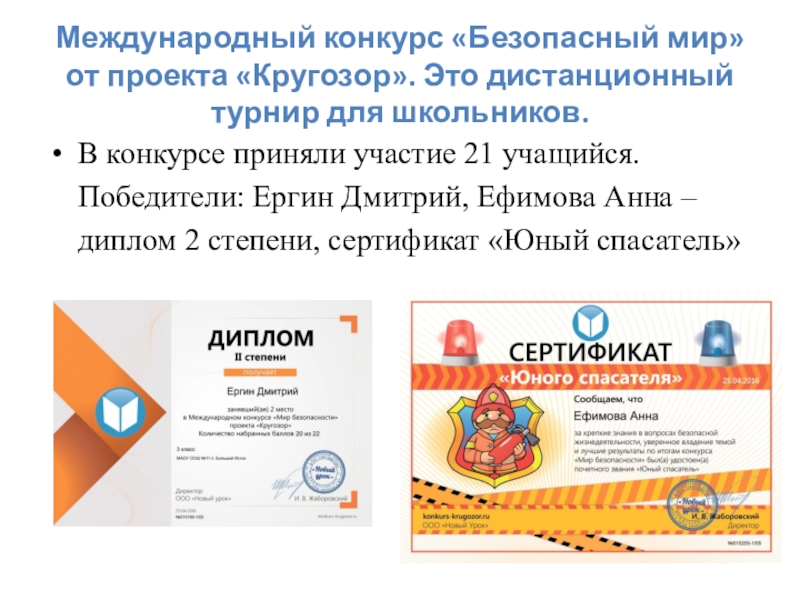 В конкурсе приняли участие 21 учащийся. Победители: Ергин Дмитрий, Ефимова Анна – диплом 2 степени, сертификат «Юный спасатель»