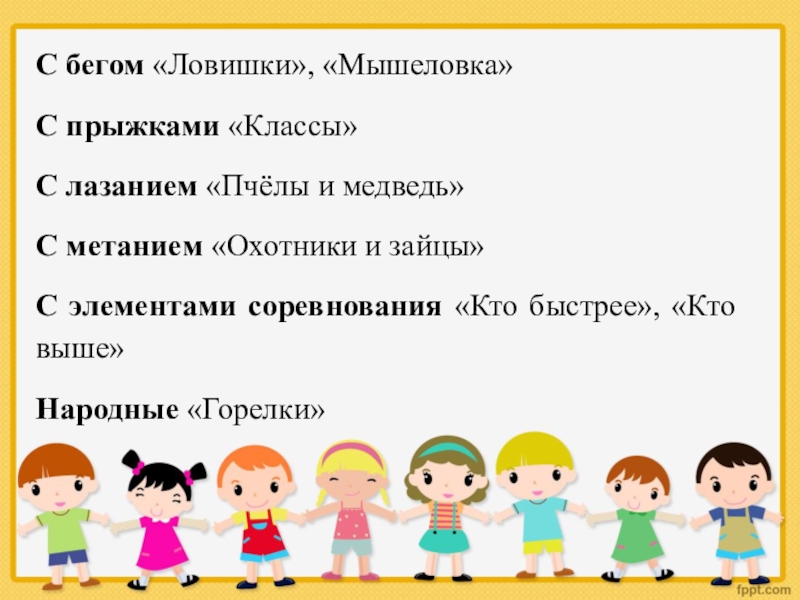 участвует вся группа детей; построены они в основном на таких движениях, как бег и прыжки.