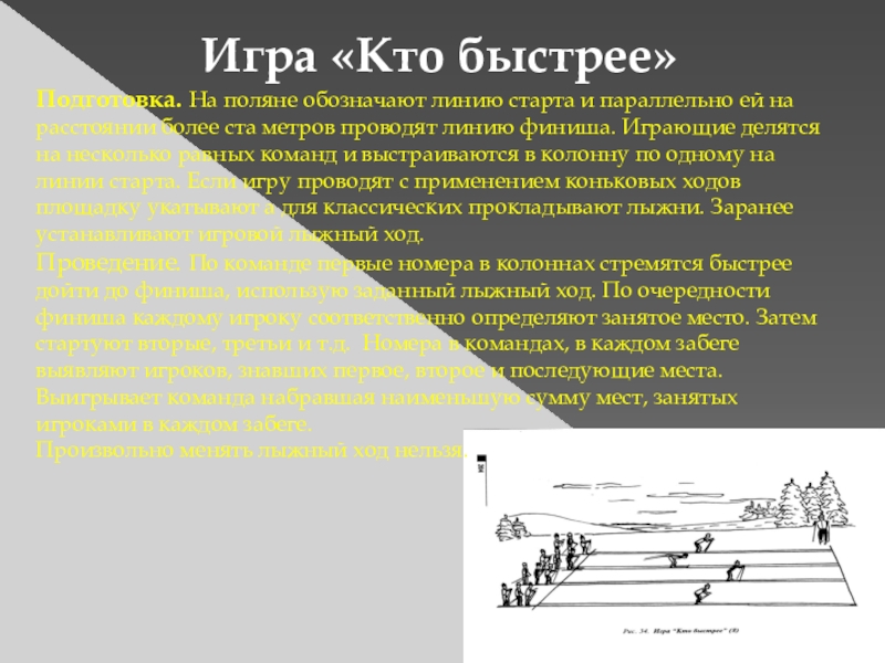 Проведение. По команде первые номера в колоннах стремятся быстрее дойти до финиша, использую заданный лыжный ход. По очередности финиша каждому игроку соответственно определяют занятое место. Затем стартуют вторые, третьи и т.д. Номера в командах, в каждом забеге выявляют игроков, знавших первое, второе и последующие места. Выигрывает команда набравшая наименьшую сумму мест, занятых игроками в каждом забеге.