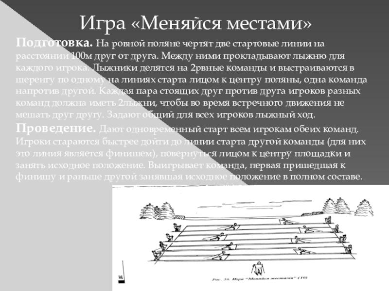 расстоянии 100м друг от друга. Между ними прокладывают лыжню для каждого игрока. Лыжники делятся на 2рвные команды и выстраиваются в шеренгу по одному на линиях старта лицом к центру поляны, одна команда напротив другой. Каждая пара стоящих друг против друга игроков разных команд должна иметь 2лыжни, чтобы во время встречного движения не мешать друг другу. Задают общий для всех игроков лыжный ход.