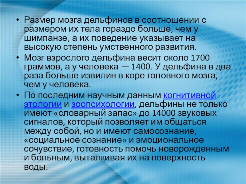 Слайд 8Размер мозга дельфинов в соотношении с размером их тела гораздо больше,