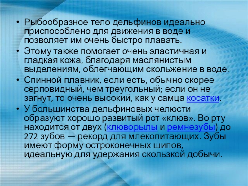 Слайд 6Рыбообразное тело дельфинов идеально приспособлено для движения в воде и позволяет