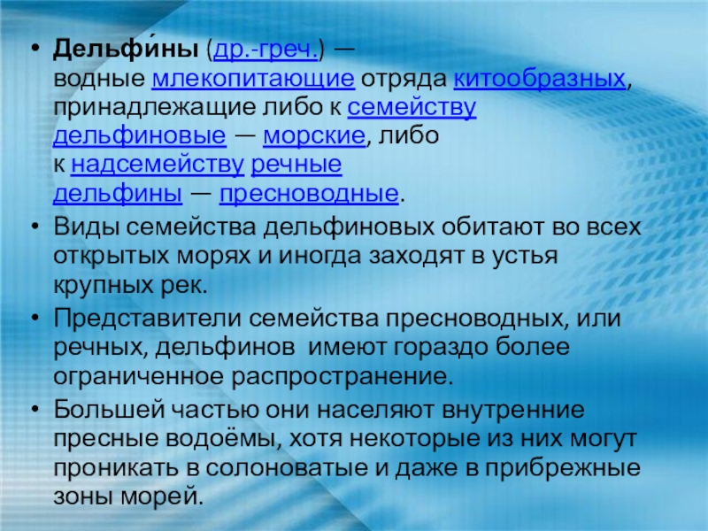 Слайд 4Дельфи́ны (др.-греч.) — водные млекопитающие отряда китообразных, принадлежащие либо к семейству дельфиновые — морские, либо к надсемейству речные дельфины — пресноводные.