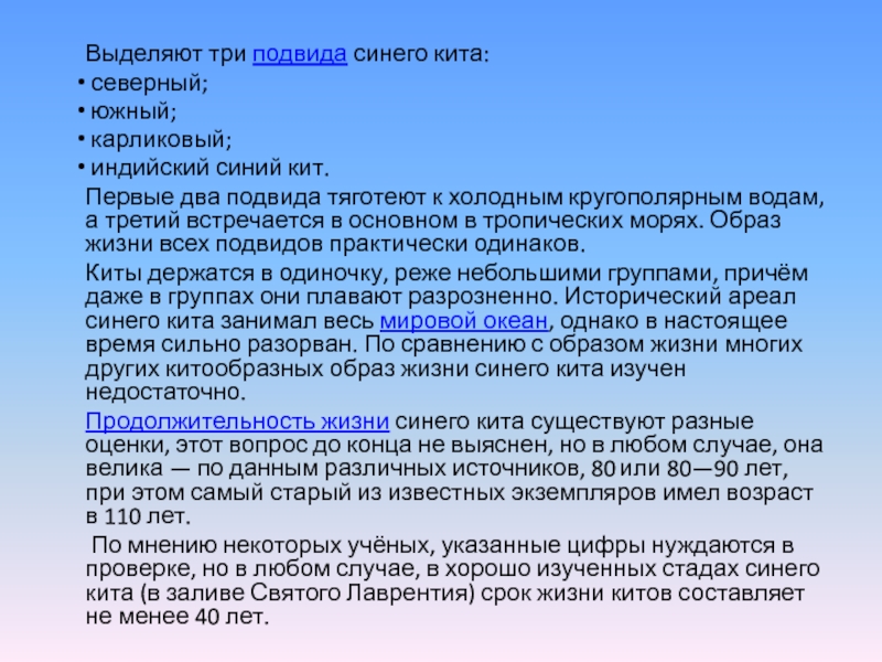 Выделяют три подвида синего кита: северный; южный; карликовый; индийский синий кит. Первые два подвида тяготеют к холодным кругополярным водам,