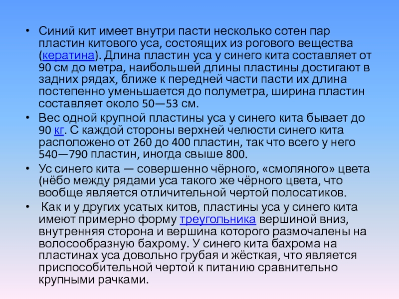 Синий кит имеет внутри пасти несколько сотен пар пластин китового уса, состоящих из рогового вещества (кератина). Длина