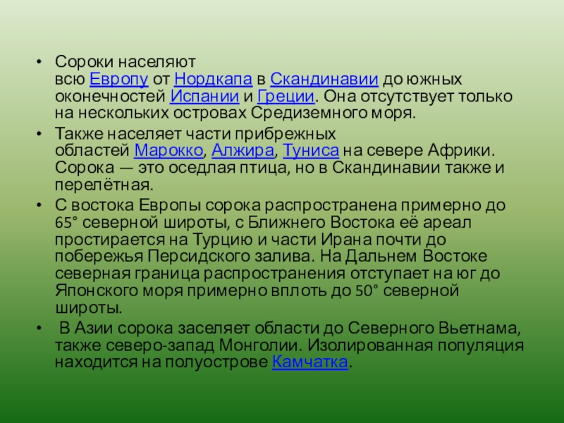 Слайд 3Сороки населяют всю Европу от Нордкапа в Скандинавии до южных оконечностей Испании и Греции. Она отсутствует только на нескольких островах