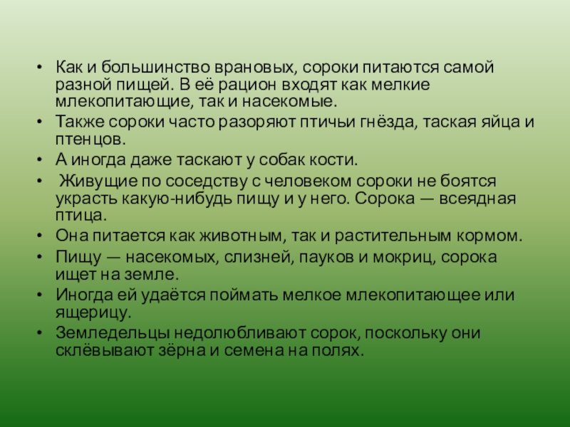 Слайд 12Как и большинство врановых, сороки питаются самой разной пищей. В её