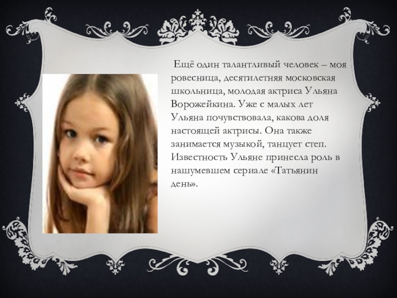 молодая актриса Ульяна Ворожейкина. Уже с малых лет Ульяна почувствовала, какова доля настоящей актрисы. Она также занимается музыкой, танцует степ. Известность Ульяне принесла роль в нашумевшем сериале «Татьянин день».