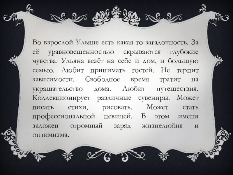 Слайд 14Во взрослой Ульяне есть какая-то загадочность. За её уравновешенностью скрываются глубокие