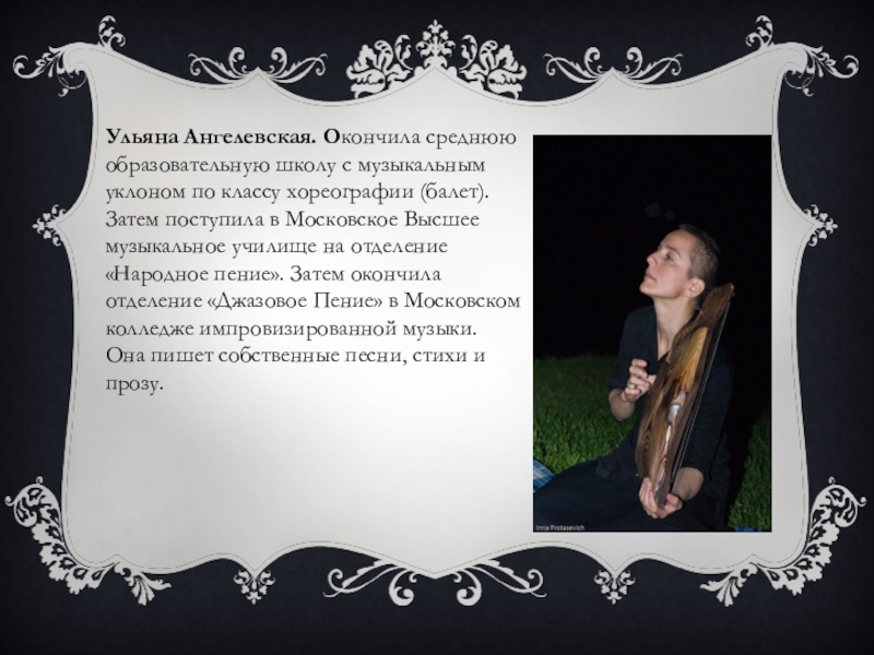 Слайд 21Ульяна Ангелевская. Окончила среднюю образовательную школу с музыкальным уклоном по классу