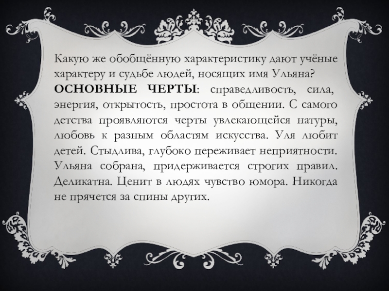 ОСНОВНЫЕ ЧЕРТЫ: справедливость, сила, энергия, открытость, простота в общении. С самого детства проявляются черты увлекающейся натуры, любовь к разным областям искусства. Уля любит детей. Стыдлива, глубоко переживает неприятности. Ульяна собрана, придерживается строгих правил. Деликатна. Ценит в людях чувство юмора. Никогда не прячется за спины других.