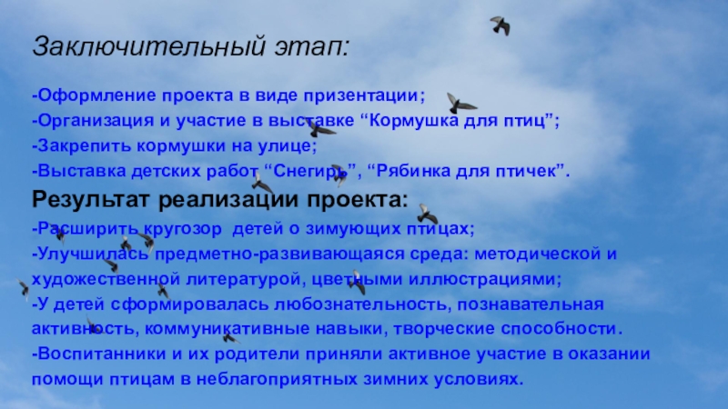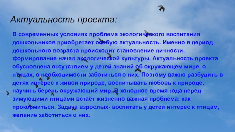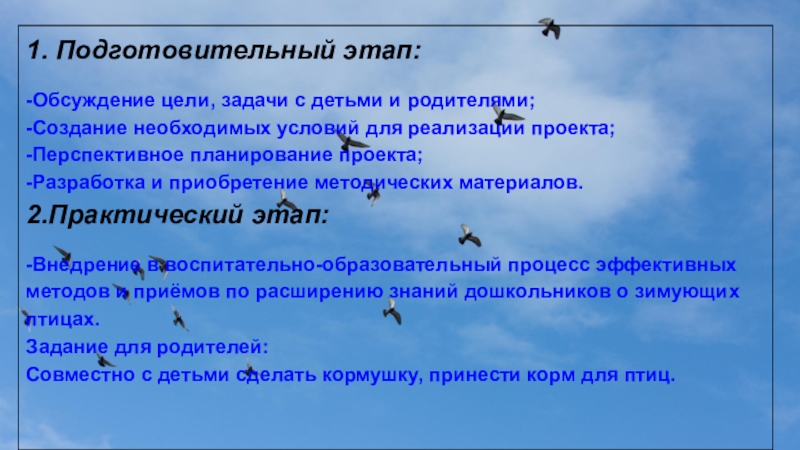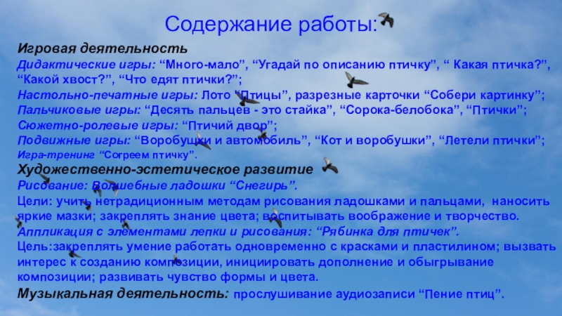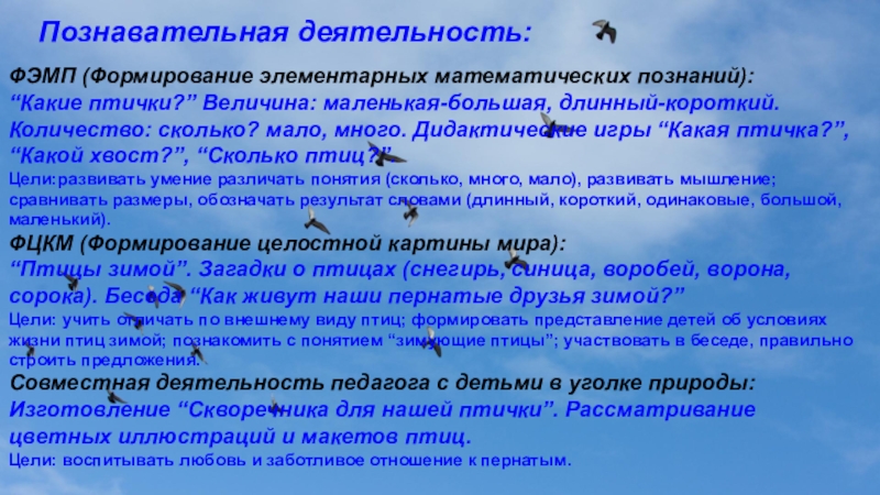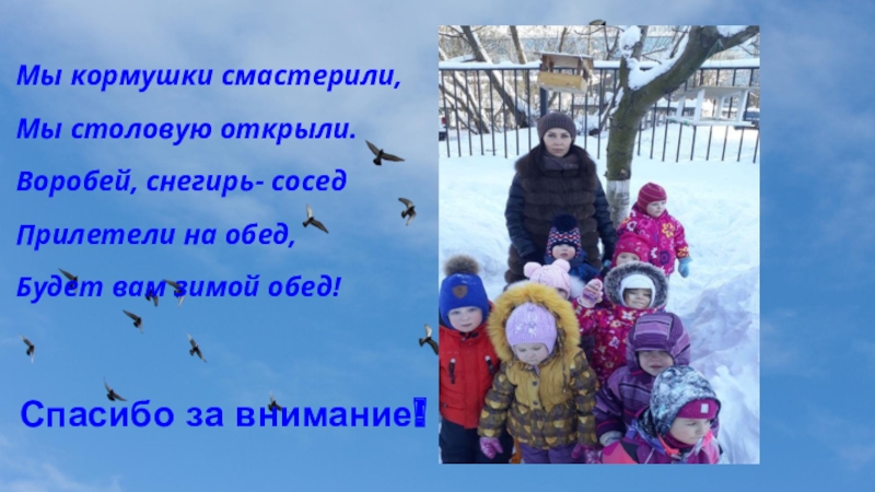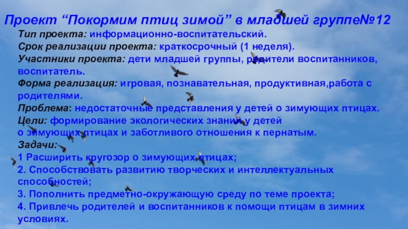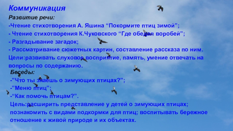 Цель:расширить представление у детей о зимующих птицах; познакомить с видами подкормки для птиц; воспитывать бережное отношение к живой природе и их объектах.