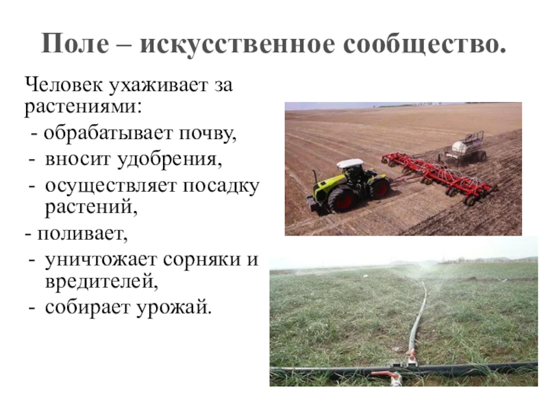 Поле – искусственное сообщество.Человек ухаживает за растениями: - обрабатывает почву, вносит удобрения, осуществляет посадку растений,- поливает,уничтожает сорняки и вредителей,собирает урожай.
