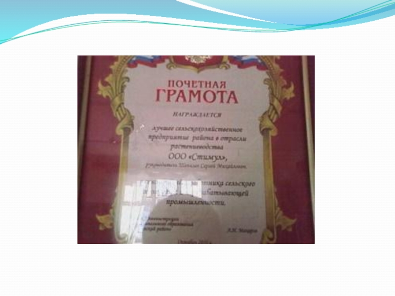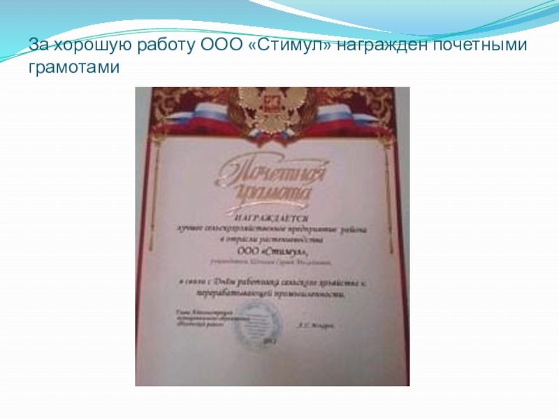 Слайд 19За хорошую работу ООО «Стимул» награжден почетными грамотами