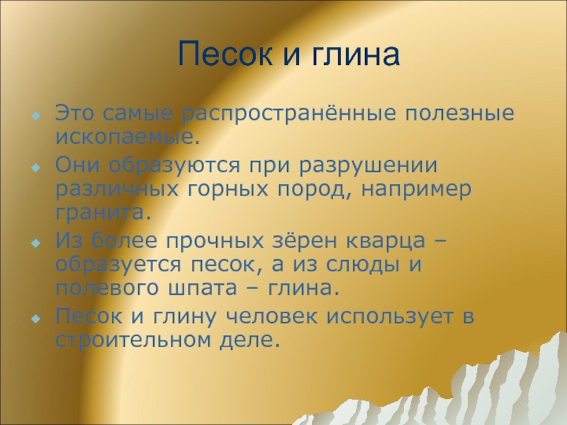 Песок и глинаЭто самые распространённые полезные ископаемые.Они образуются при разрушении различных горных пород, например гранита.Из более прочных зёрен кварца – образуется песок, а из слюды и полевого шпата – глина.Песок и глину человек использует в строительном