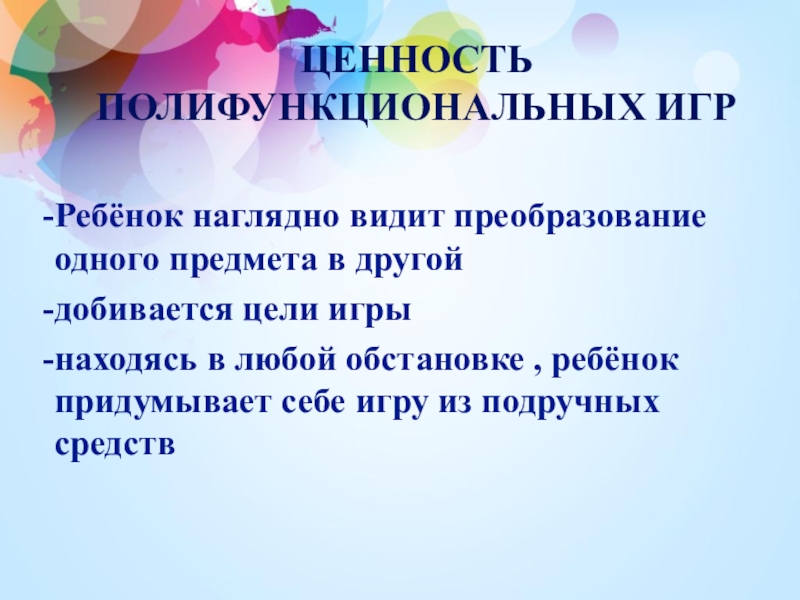 ЦЕННОСТЬ ПОЛИФУНКЦИОНАЛЬНЫХ ИГРРебёнок наглядно видит преобразование одного предмета в другойдобивается цели игрынаходясь в любой обстановке , ребёнок