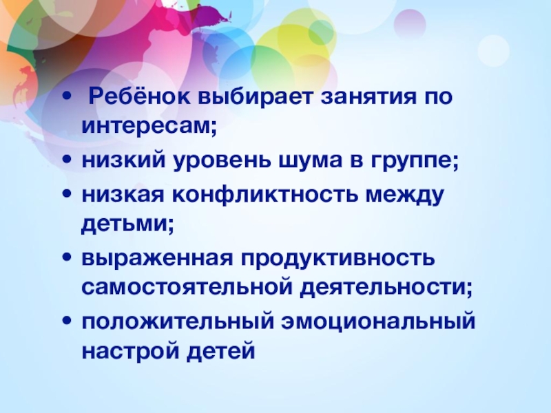 Ребёнок выбирает занятия по интересам;низкий уровень шума в группе;низкая конфликтность между детьми;выраженная продуктивность самостоятельной деятельности;положительный эмоциональный