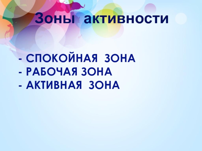 - СПОКОЙНАЯ ЗОНА  - РАБОЧАЯ ЗОНА  - АКТИВНАЯ ЗОНА  Зоны активности