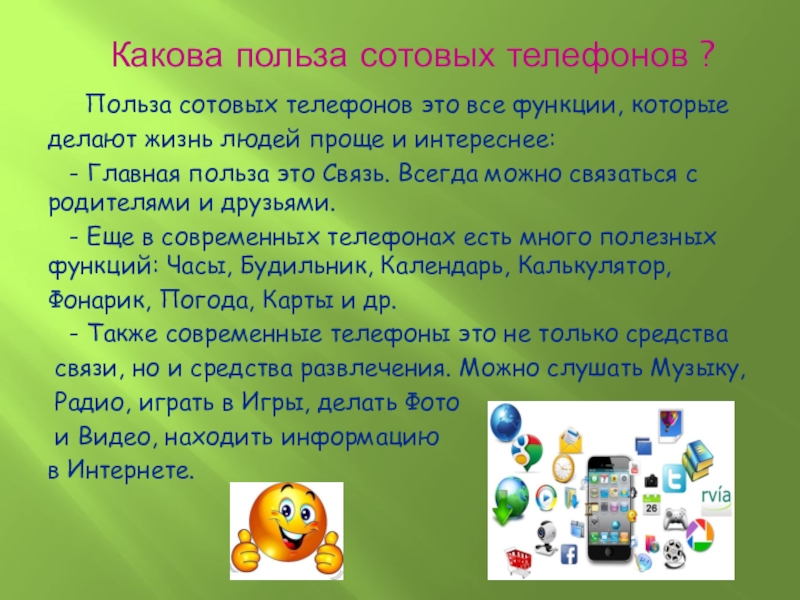Слайд 6 Какова польза сотовых телефонов ?